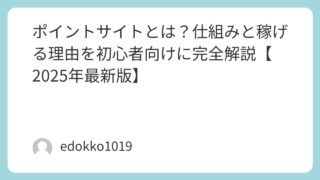 初心者ガイド ポイントサイトとは?仕組みと稼げる理由を初心者向けに完全解説【2025年最新版】 ポイントサイトとは?広告経由でポイントを貯め、1P=1円相当で交換する仕組みをやさしく解説。安全に始めるコツや失敗しない使い方、初心者向けおすすめも紹介。【2025年最新】 2025.09.20 初心者ガイド